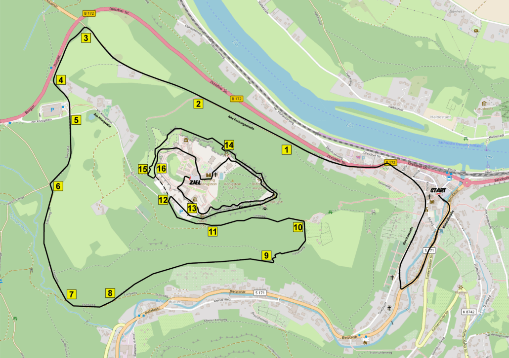 Anspruchsvolles, bergiges Profi, stellenweise schmale Wege und Pfade, Überwindung von 470 Höhenmetern, die letzten 1,2 km werden auf dem Plateau der Festung Königstein gelaufen.