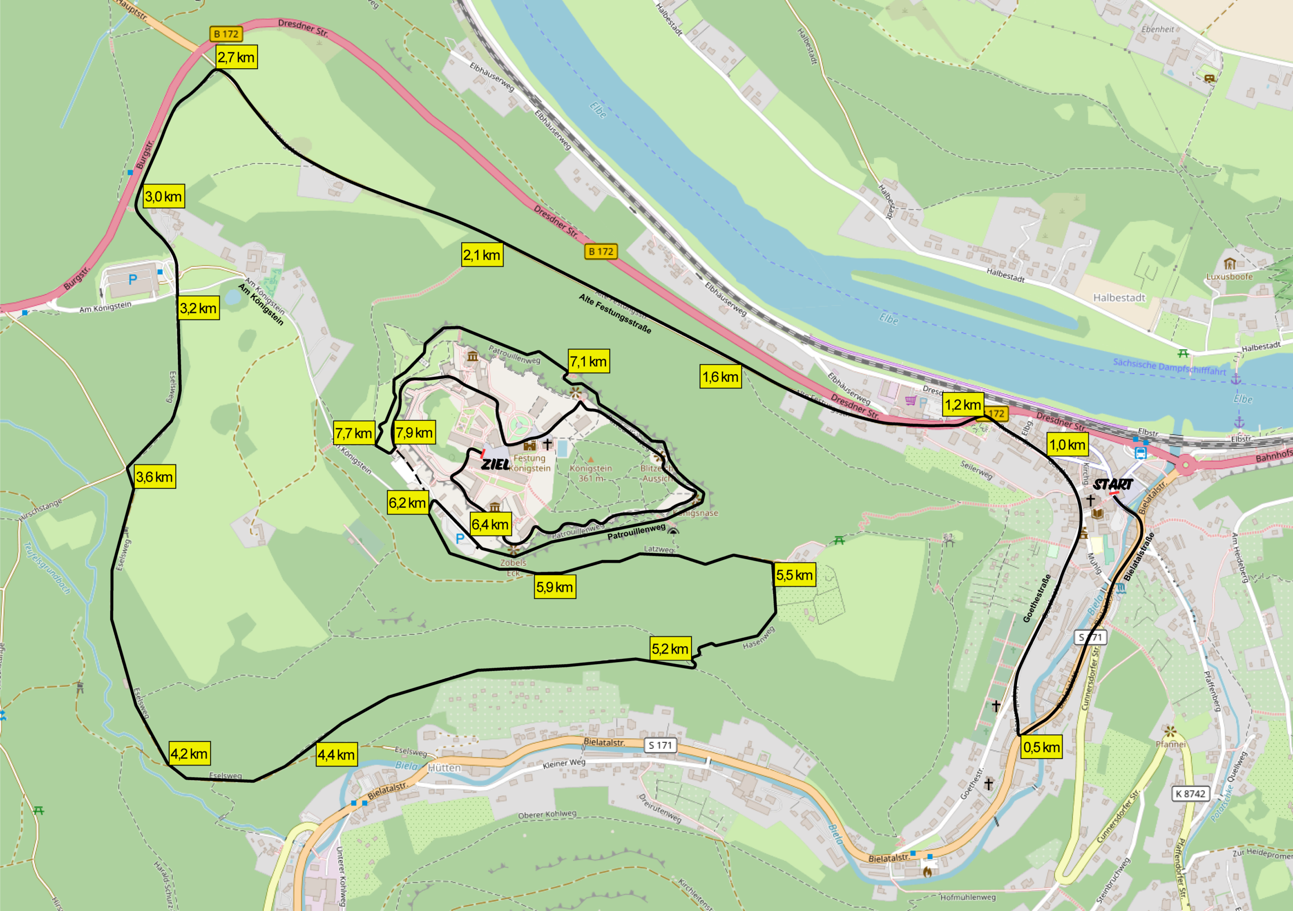 Startort ist der Platz vor der Touristinformation in der Pirnaer Straße 2 in Königstein (Stadtplatz).